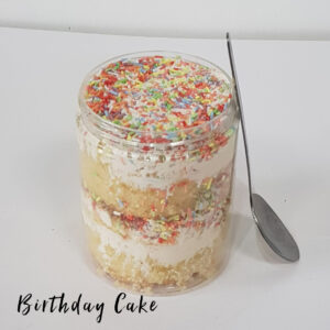 Birthday Cake – our simple yet delicious fluffy moist vanilla sponge cake layered with vanilla creme and a dose of colourful sprinkles