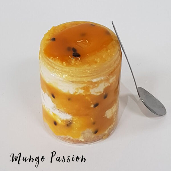 Mango and Passion – vanilla cake layered with mango coulis, passionfruit curd and vanilla crème