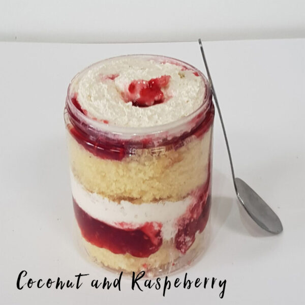 Coconut and Raspberry – coconut sponge with raspberry jam and vanilla mousse crème.